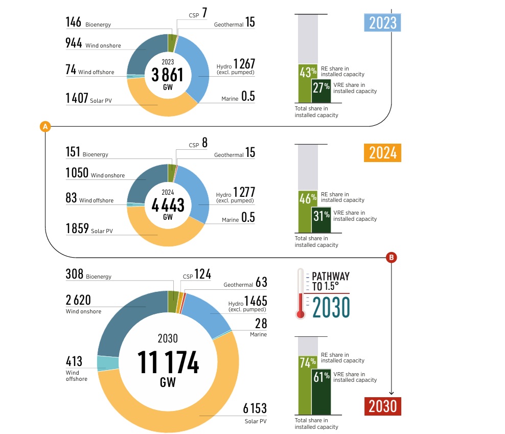 Figure 1: Global installed renewable power capacity in the 1.5°C Scenario, 2023, 2024 and 2030
