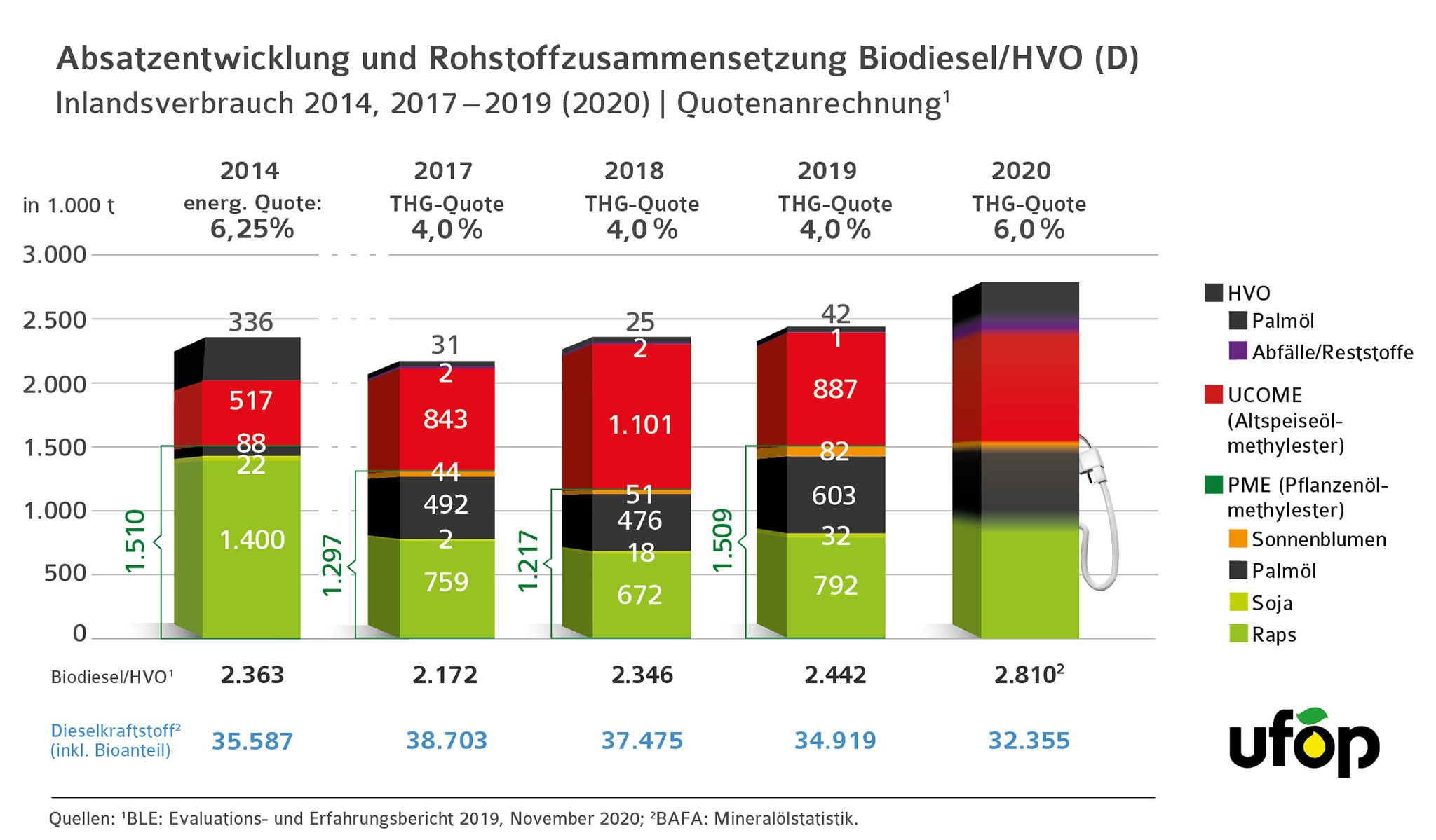 (Union zur Förderung von Oel- und Proteinpflanzen (UFOP)) Since the introduction of the quota system in 2007, the admixture of biofuels to diesel fuel reached a record level of around 2.8 million tonnes. The Union for the Promotion of Oil and Protein Plants eV is referring to the statistics published at the beginning of this week by the Federal Office for Economics and Export Control (BAFA). UFOP sees its expectation confirmed that the GHG quota, which has increased from 4 to 6 percent for 2020, could be met without any problems. The sufficient availability of hydrogenated vegetable oil (HVO) played an important role.