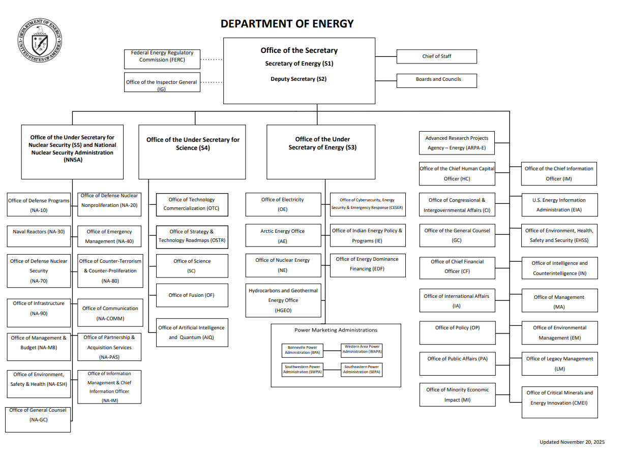 (U.S. Department of Energy) The U.S. Department of Energy (DOE) today announced an organizational realignment designed to strengthen DOE’s ability to execute President Trump’s bold agenda to restore American energy dominance. -- The U.S. Department of Energy (DOE) today announced an organizational realignment designed to strengthen DOE’s ability to execute President Trump’s bold agenda to restore American energy dominance. This realignment reflects the Administration’s priorities of expanding American energy production, accelerating scientific and technological leadership, and ensuring the continued safety and readiness of the Nation’s nuclear weapons stockpile.