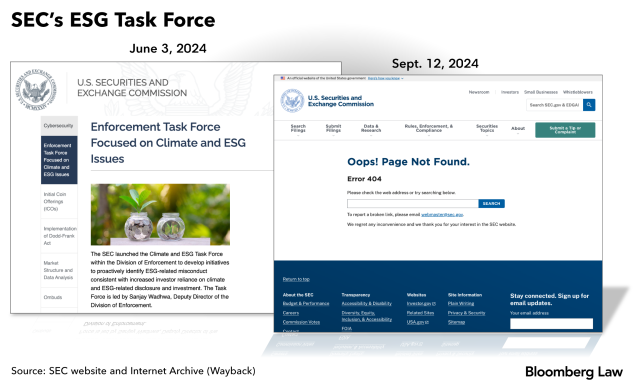 The agency previously promoted the task force’s work on a web page that last listed 16 ESG-related enforcement actions from 2008 to 2022, half of which predate the group’s launch.