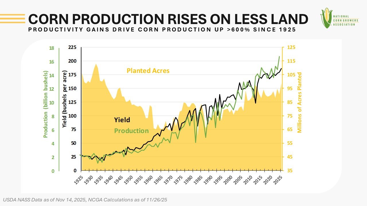 Remarkable growth in corn yields has boosted corn productivity in the United States over the past century. While corn production has risen, the land used to grow corn has not. United States farmers planted an estimated 98.7 million acres of corn in 2025, the highest total acreage since 1935.