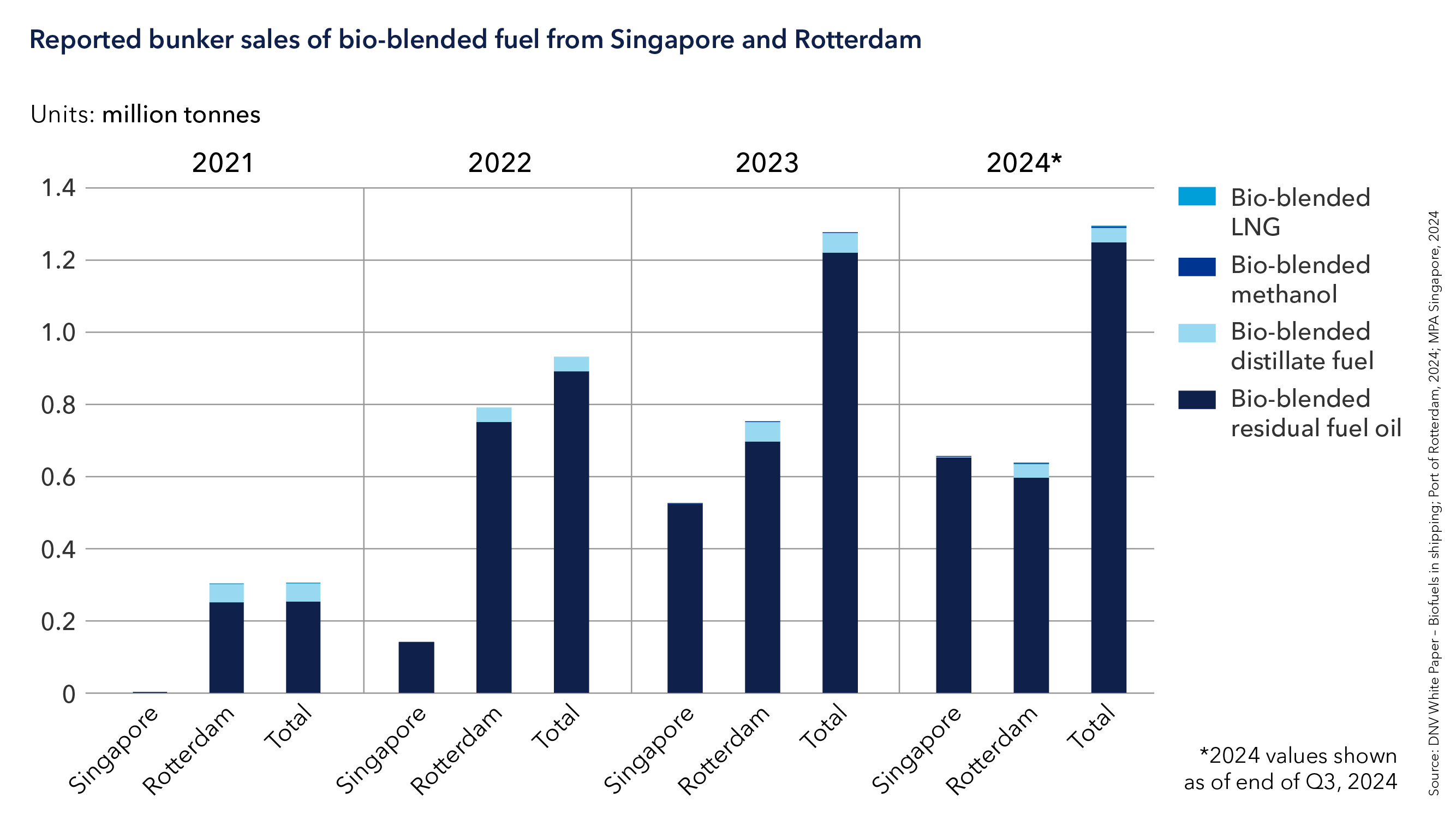 Reported bunker sales of bio-blended fuel from Singapore and Rotterdam