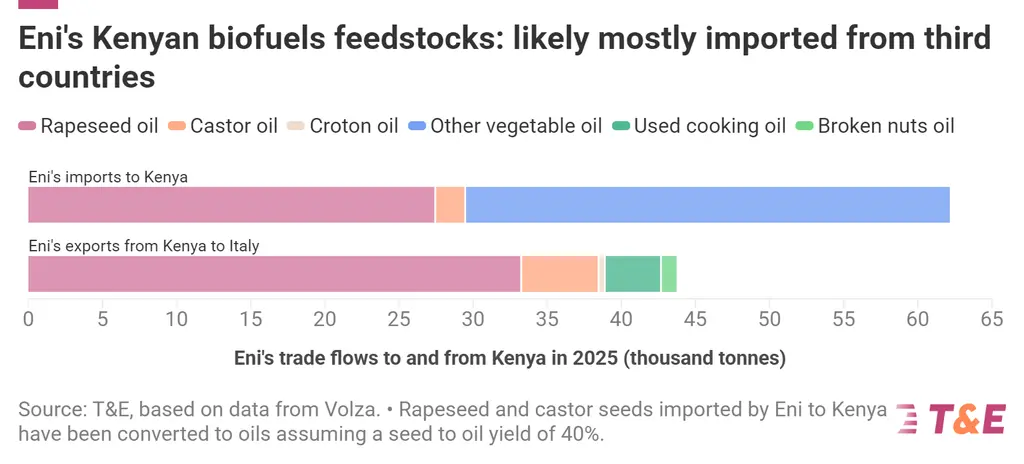 Yet, trade records assessed by T&E show that Eni imported significant amounts of rapeseed from South Africa into its Kenyan subsidiaries[1]. Customs records then appear to indicate that much of the rapeseed oil is re-exported to Italy, which could account for up to 80% of all of Eni’s exports from Kenya to its refineries in Gela and Venice in 2025. Eni disputes this, claiming that it is in fact 40%. READ MORE
