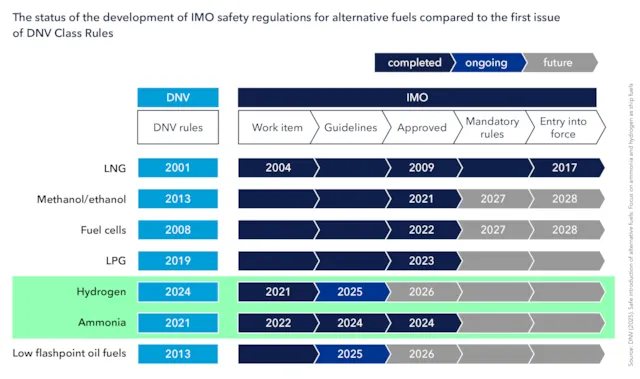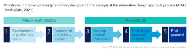 by Linda Sigrid Hammer (DNV) As the maritime industry moves towards zero-emission operations, ammonia and hydrogen are gradually emerging as suitable ship fuels due to their carbon-free emissions. These new fuels require a change of mindset in terms of design, operations and crew competence, all addressed in a new DNV paper. With no specific IMO regulation available, IMO's alternative design approval (ADA) process is essential for approval, and the paper outlines how DNV rules provide structured, prescriptive requirements to simplify the procedure.