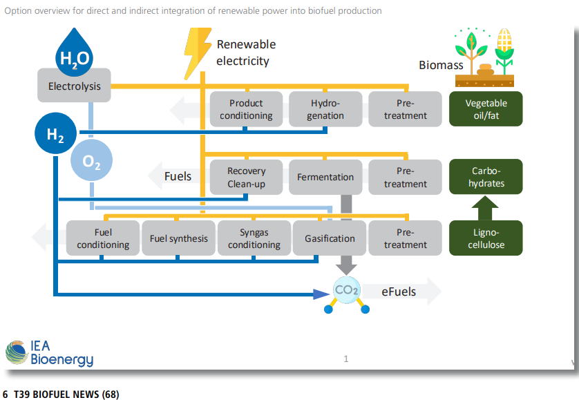 by Nicolaus Dahmen (KIT/IEA Bioenergy Task 39 Biofuel News) During biofuel production, carbon and the utilization of fossil-based energy often limit the full potential of GHG emission reduction. By integrating renewable energy and maximizing the carbon utilization favorable advantages in terms of ecological as well as economic process performance can be expected. Bioenergy Task 42 report “Integration of biorefineries and green hydrogen” gave already first insights on the techno-economic and ecologic feasibility of such synergies. The new project now aims at a systematic approach to further explore the potential for synergies specifically in biofuel production value chains.