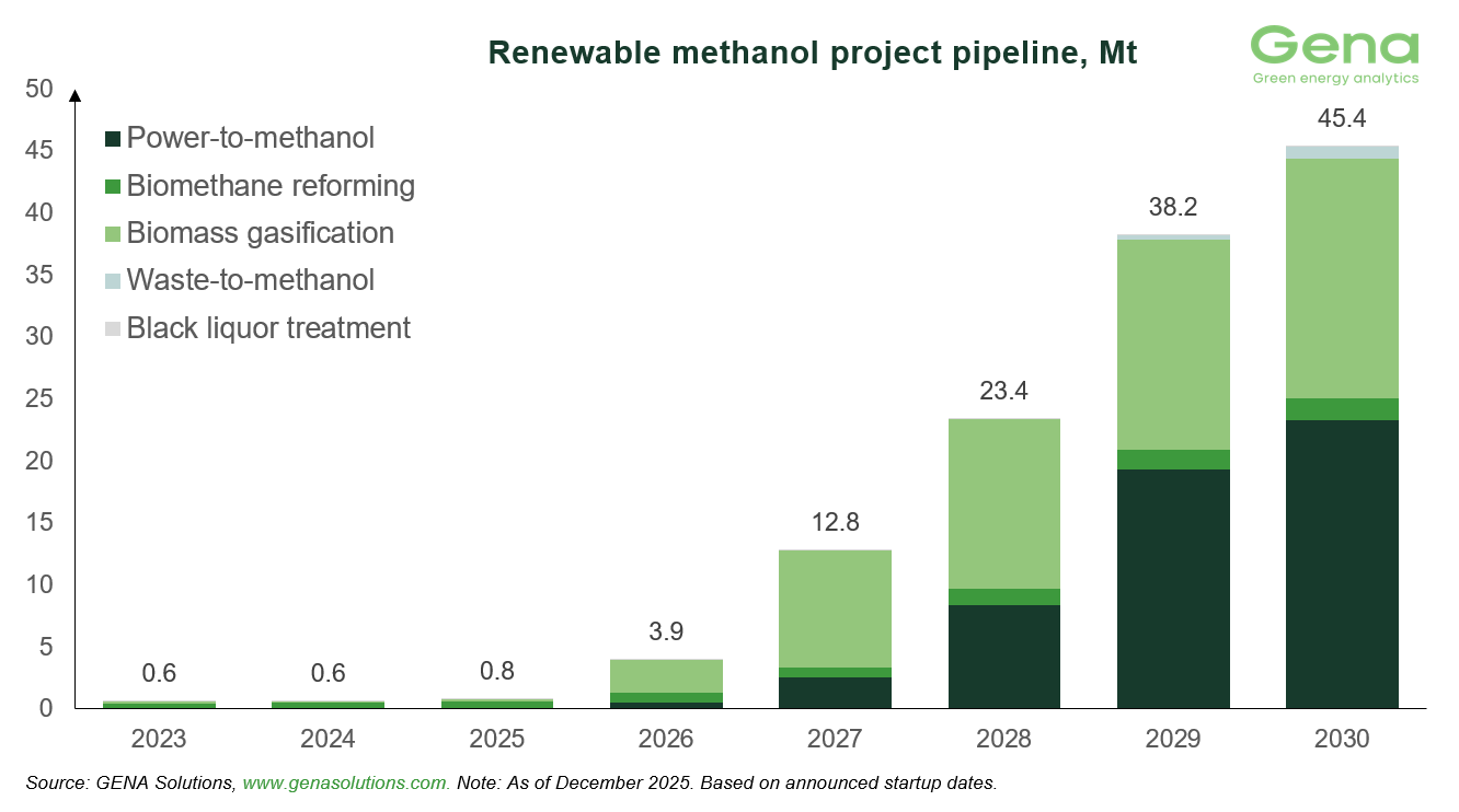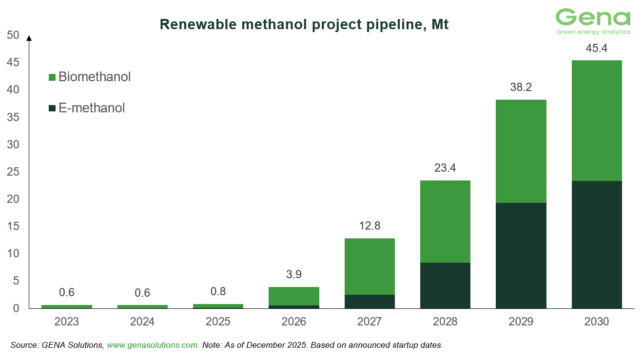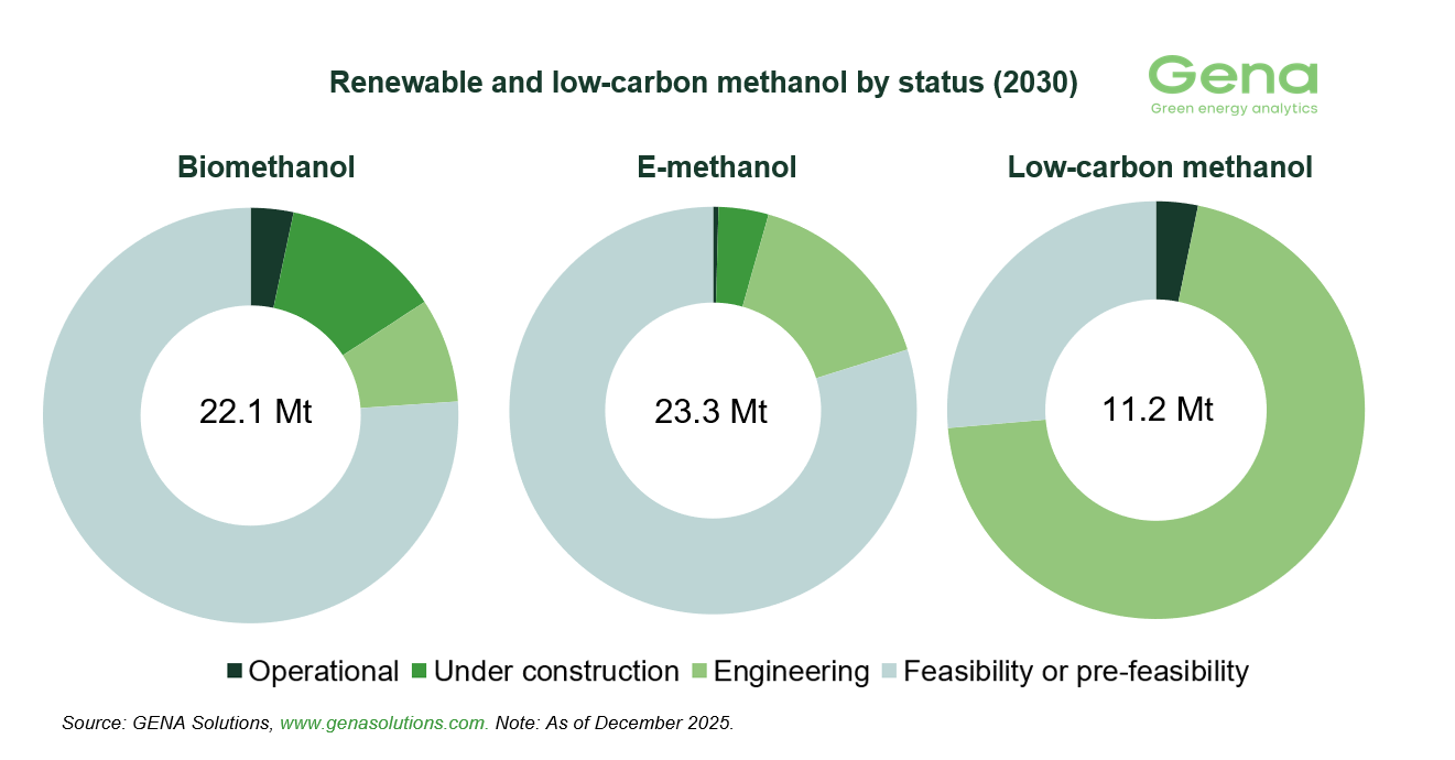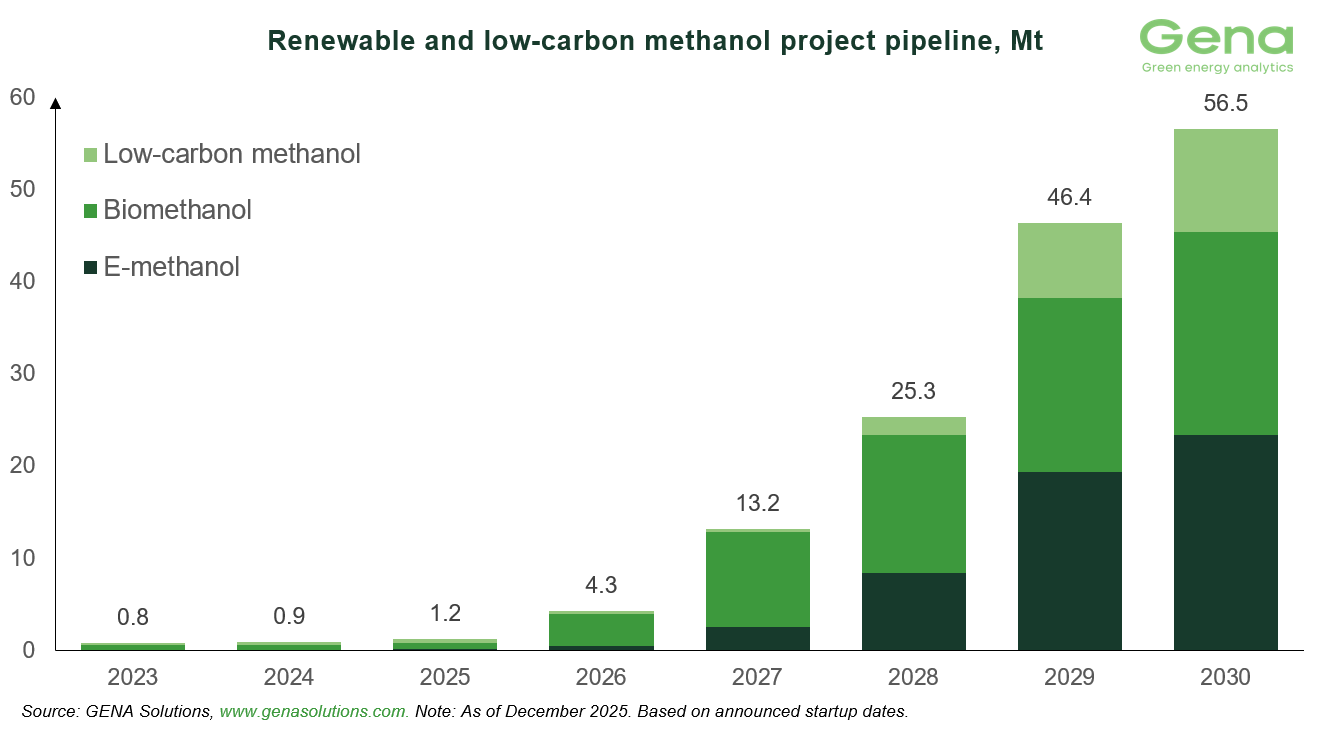 - By the end of December 2025, Project Navigator Methanol tracked 273 renewable and low-carbon methanol projects totaling 56.5 Mt by 2030, including 23.3 Mt of e-methanol, 22.1 Mt of biomethanol, and 11.2 Mt of low-carbon methanol.