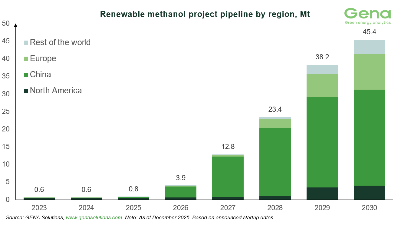 As of December 2025, GENA’s Project Navigator Methanol tracks 273 renewable and low-carbon methanol plants and projects with a total capacity of 56.5 Mt by 2030, including:
