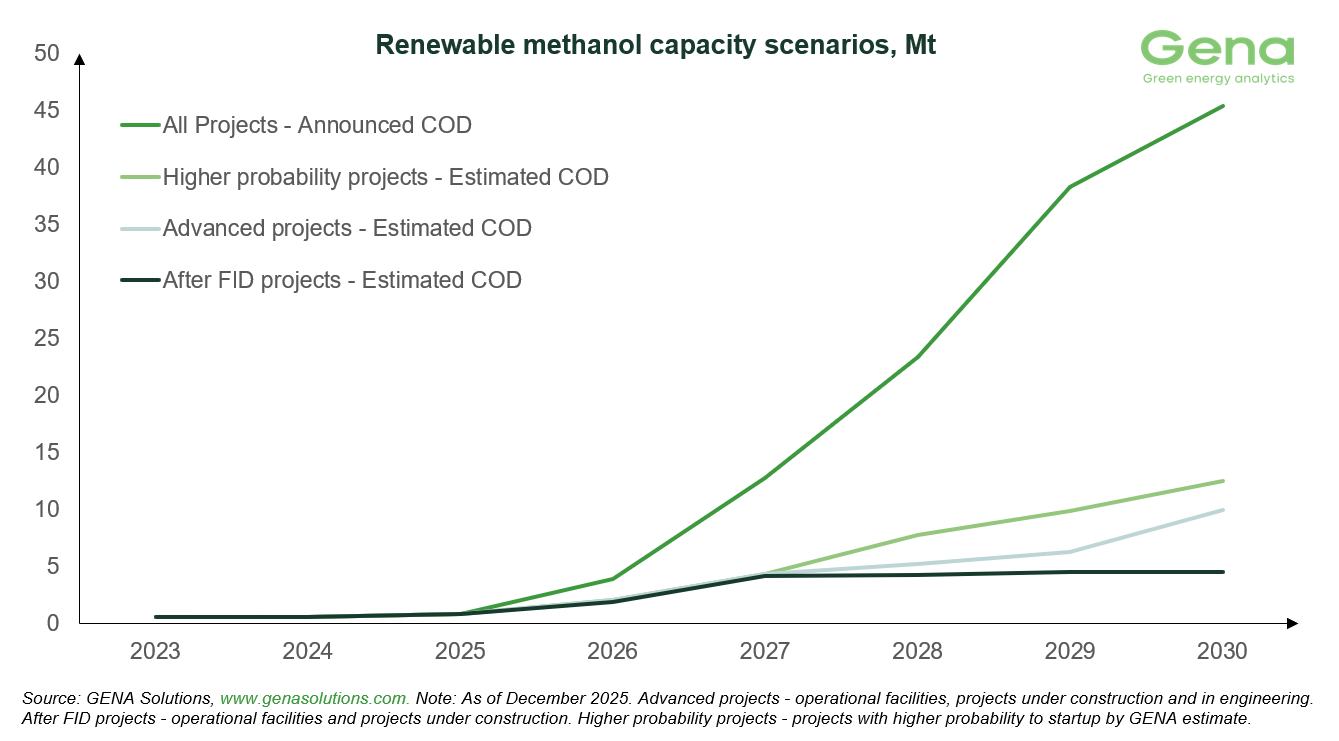 In 2026, we expect renewable methanol capacity could reach about 2 Mt—a more than two-fold increase compared to 2025. At the same time, there will likely be a slowdown in project pipeline growth compared to 2024–2025, partially due to an increase in the number of frozen projects.