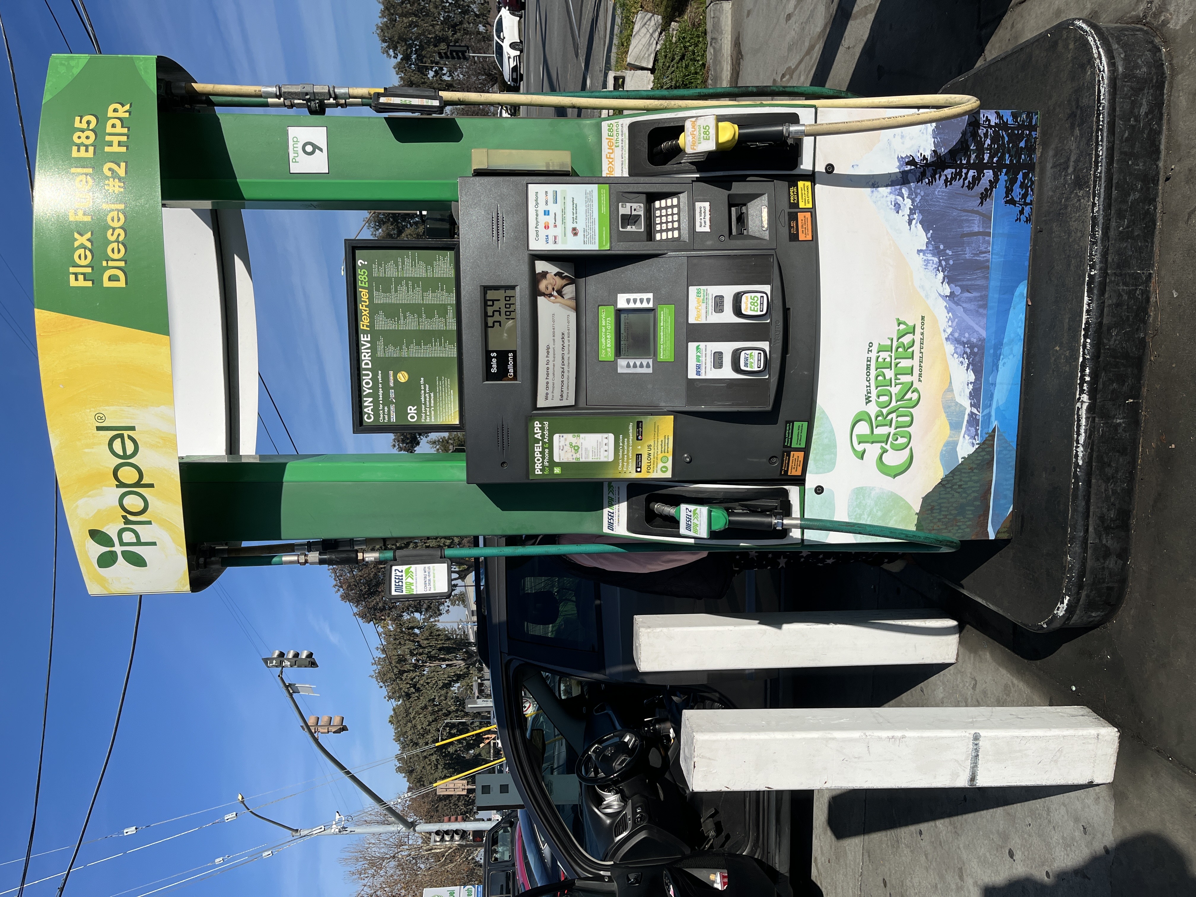 Although Governor Gavin Newsom signed California legislation enabling sales of E15 (15% ethanol and 85% gasoline), it doesn't seem to be available at retail yet. However, Ji did find an enthusiastic E85 user and pumps selling B20+.