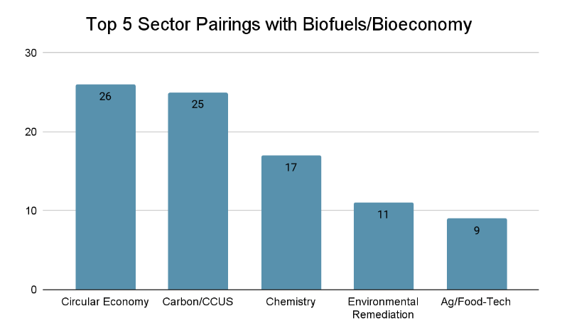 In the AES dataset, each startup was categorized into a maximum of three different “categories” or taxonomies in order to describe what that particular startup focuses on. Some taxonomies describe a sector, such as “nuclear” or “wind”, while others describe functions or services offered, such as “consulting” and “evaluation/compliance.” This taxonomy system allows for analysis of common pairings between certain sectors and what that could mean for that industry moving forward. The top five most commonly found pairings with the “Biofuels/Bioeconomy” sector are shown in the chart below:
